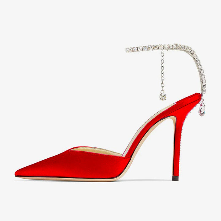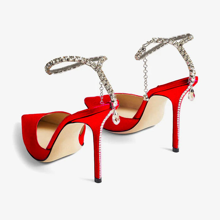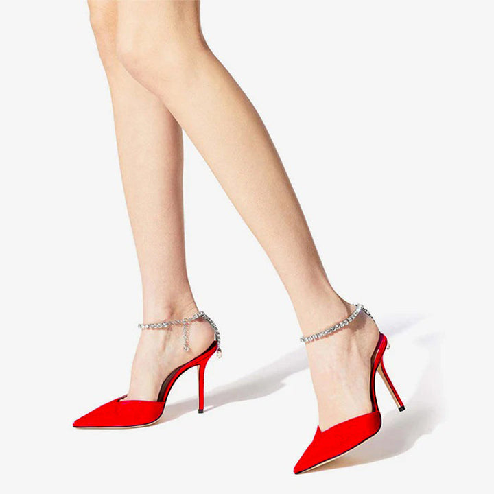 These red calf suede pumps blend footwear with jewelry, featuring a crystal chain that elegantly wraps around the ankle and cascades down the heel. This pointed-toe design sits on a slim 100mm heel, making it a striking statement piece that adds effortless glamour to any occasion.