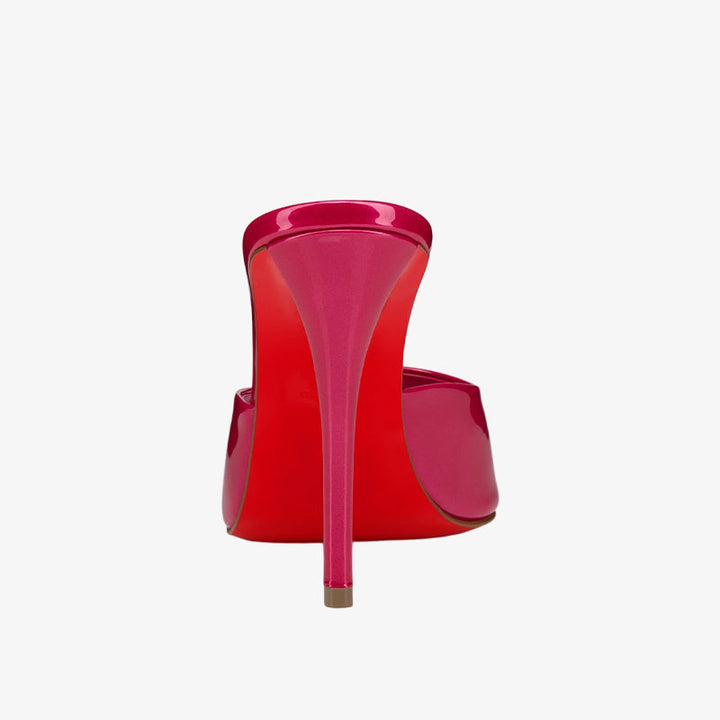 This elegant mule features a tapered silhouette in glossy fuchsia patent calf leather, a slim toe-revealing band, a padded insole, and a stiletto heel. Finished with a durable signature red sole that stays vibrant wear after wear.