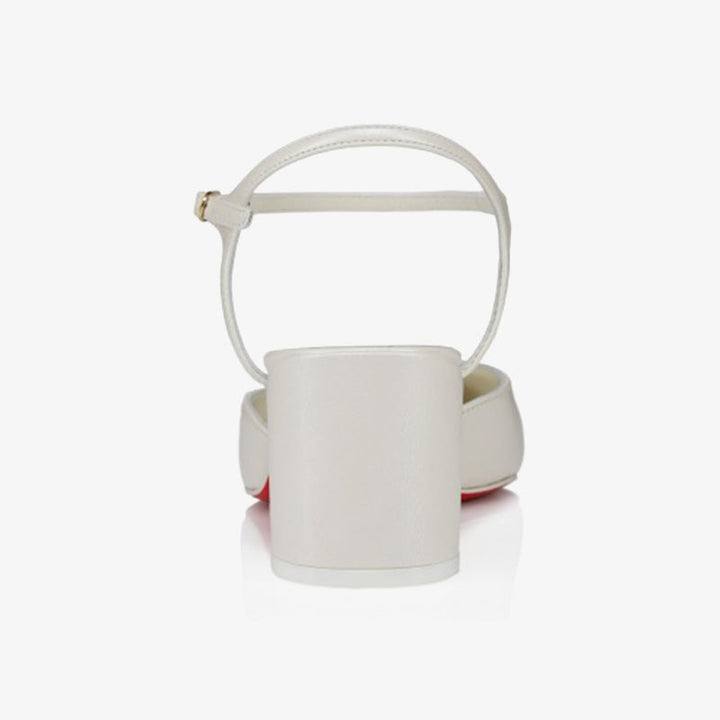 This elegant model stands out with its 55 mm beveled block heel, blending comfort with refined design. Crafted from lustrous white pearl calf leather, it features a rounded toe, a low-cut neckline that subtly reveals the foot, and delicate ankle straps that wrap gracefully for a secure fit.