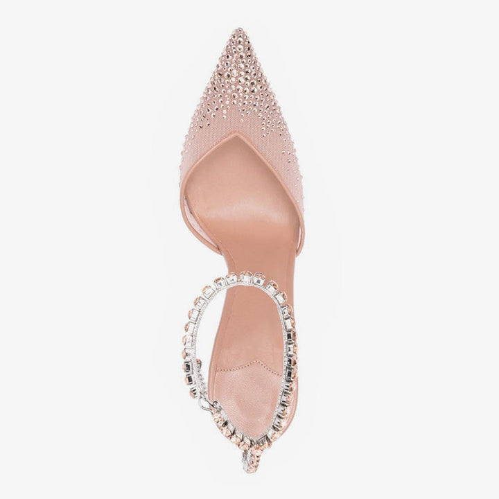 Crafted from pink tulle, these pumps are adorned with crystals from the pointed toe to the ankle strap. A delicate crystal chain drapes at the heel, ending in a pear-shaped stone. Finished with a high 100mm stiletto heel and leather sole, they blend elegance with eye-catching sparkle.Color: pink