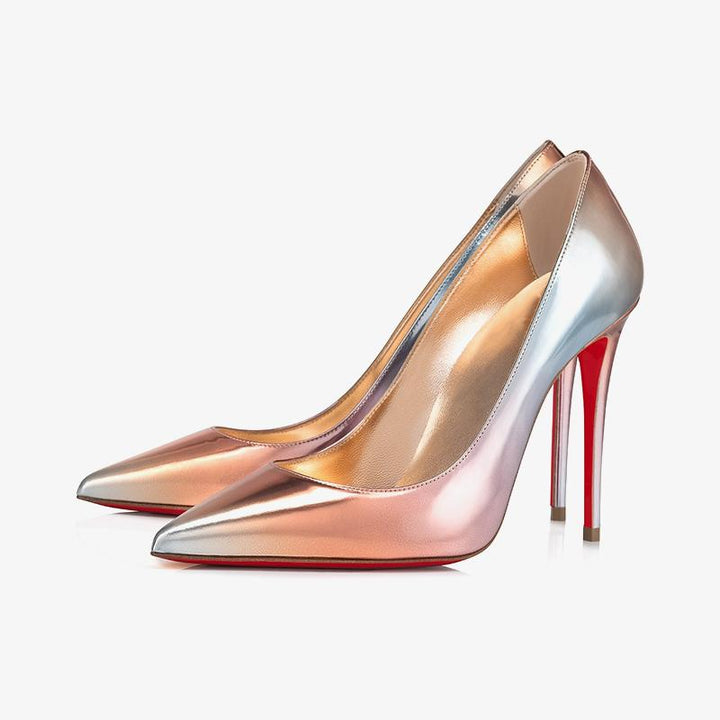 This iconic pump exudes timeless elegance with its pointed toe and low-cut vamp, revealing the foot's delicate arch. Crafted from beige Mirro-effect leather with a shimmering ombre effect, it features a striking 100mm stiletto heel, enhancing its sophisticated allure.