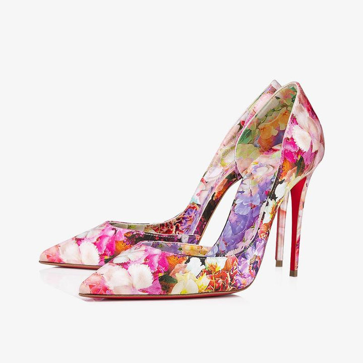 These asymmetrical pumps, part of a special Valentine’s Day collection, feature sleek lines and timeless elegance. Crafted from crepe satin with a multicolored blooming print, they have a daring low-cut vamp and pointed toe, all set on a 100 mm heel. Each pair is uniquely adorned with a distinct blooming floral pattern.