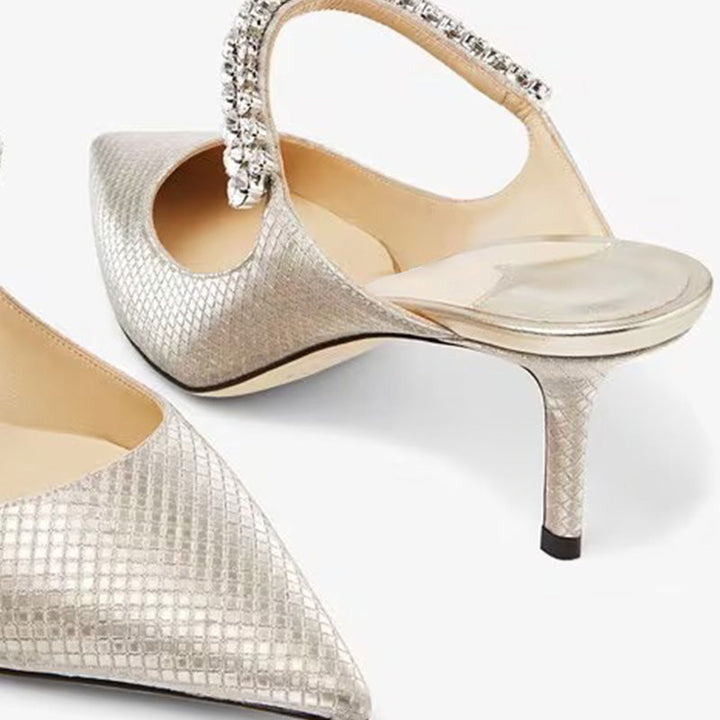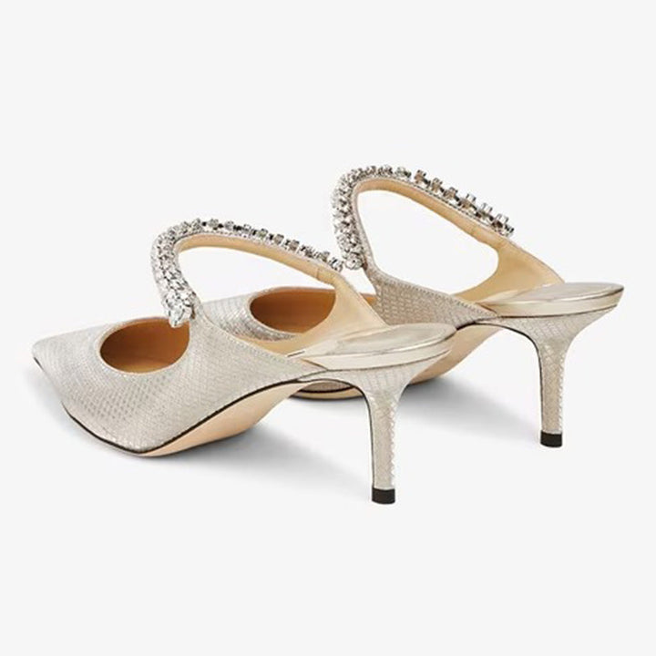 These bold mules feature a silver snake-effect finish, accented with sparkling crystal embellishments. Set on a sleek 65mm heel, they deliver a striking blend of glamour and sophistication—perfect for evening occasions or standout looks.
