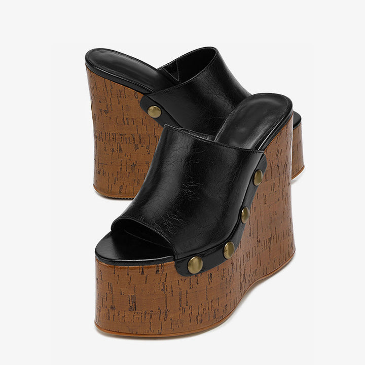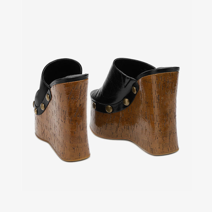 Elevate your summer style with these sleek peep toe wedge mules, crafted from premium black calf leather. Featuring a 140 mm cork-wrapped platform heel, full leather lining and decorative nail accents for a refined finish.?