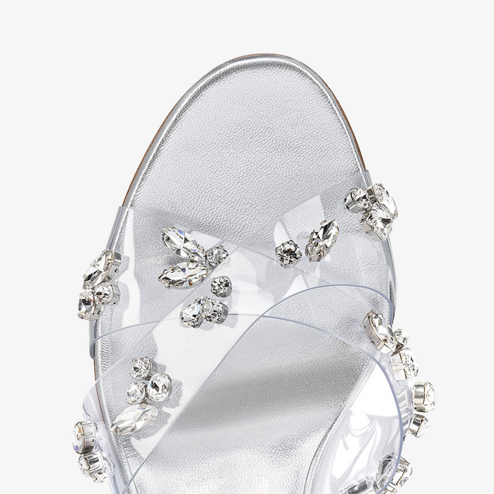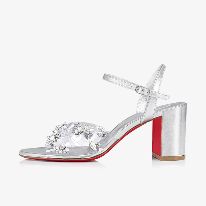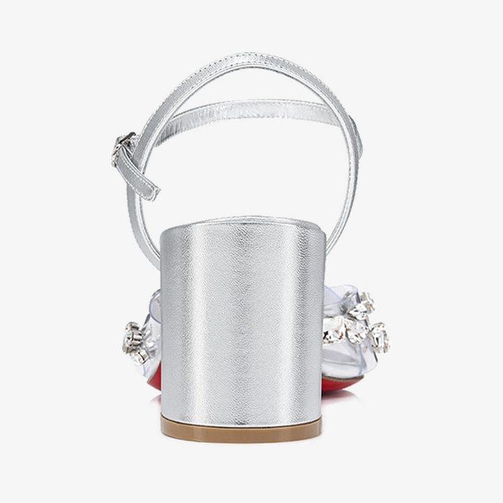This model features two transparent PVC straps adorned with striking, hand-placed, jewel-like strass that seem to float on the foot. It sits on an easy-to-wear 60 mm heel and is crafted in shimmering silver calf leather with tonal lining for an elegant and radiant finish.