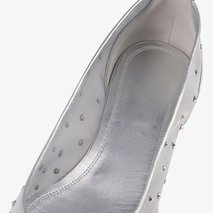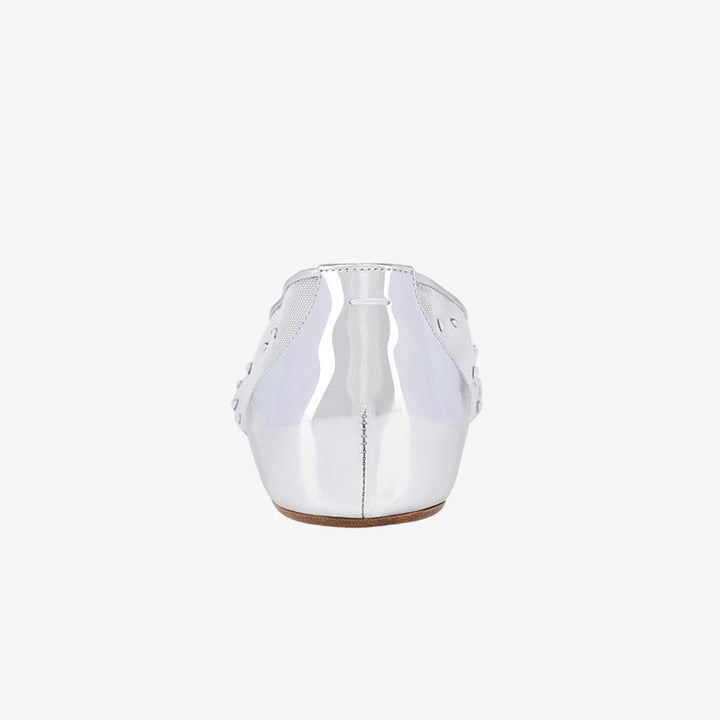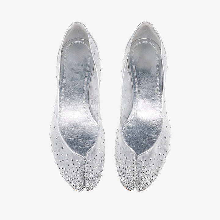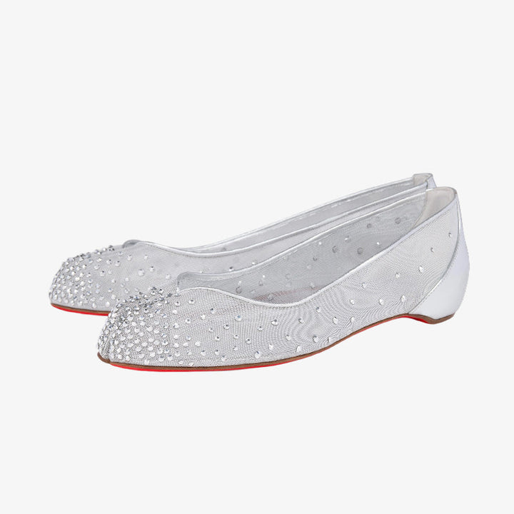 These ballet flats feature a split-toe design crafted from sheer silver mesh and laminated calf leather. Finished with a tapered silhouette, rounded neckline, elegant gradient rhinestones, and a signature red sole for a refined touch.