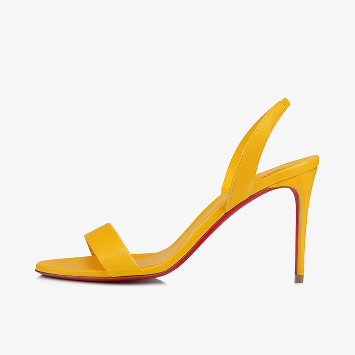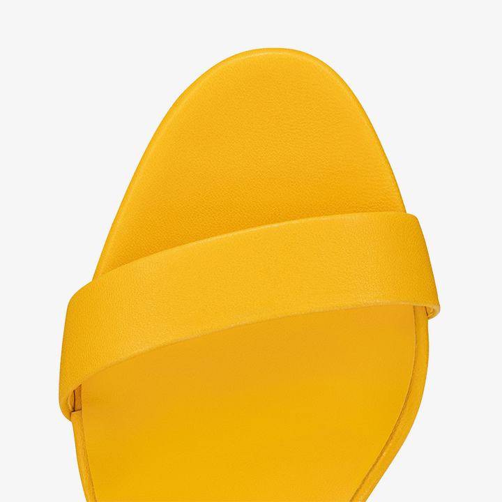 The yellow sandal is designed to stand out with its smooth, curved 80 mm heel. Featuring an almond-shaped toe, sleek arch, toe strap, and a delicate ankle strap, this sandal is crafted from calf leather, showcasing exquisite simplicity.