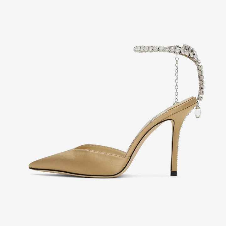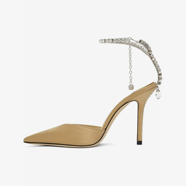 These brown heels feature a pointed toe and a crystal-adorned box chain anklet with a secure hook-eye fastening. A faceted crystal charm at the heel adds a glamorous touch, while the covered stiletto heel and leather sole complete this refined 100mm silhouette.