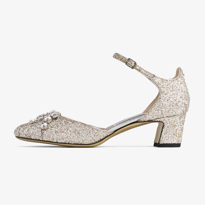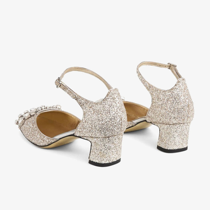 These luminous silver-tone leather pumps exude refined elegance with a radiant crystal embellishment. The round-toe design, complemented by a secure ankle strap and sturdy block heel, offers both sophistication and comfort for any occasion.The heel height of this pair is 60mm.