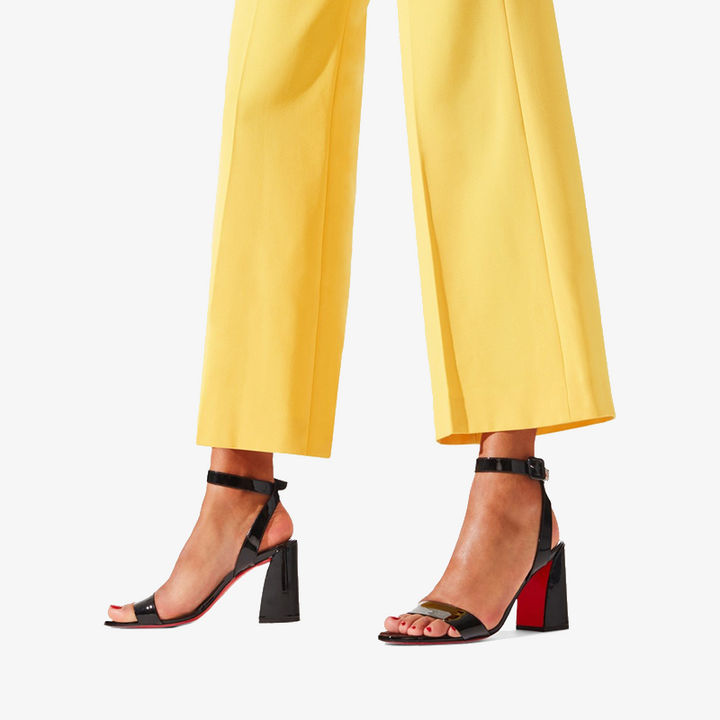 Featuring sleek lines, this sandal boasts an 100 mm asymmetrical heel. The straps cross behind the ankles and are adorned with delicate square clasps. Entirely crafted in black patent calf leather with discreet topstitching, it showcases creativity and expertise.