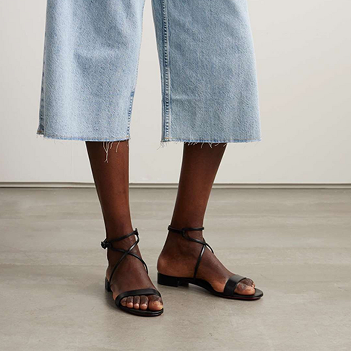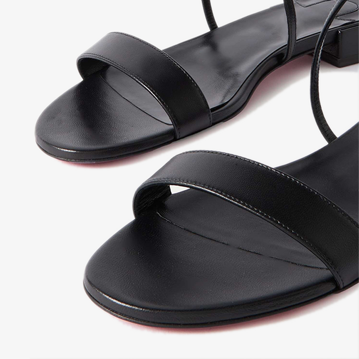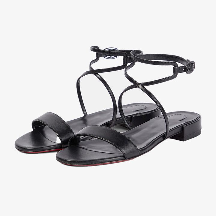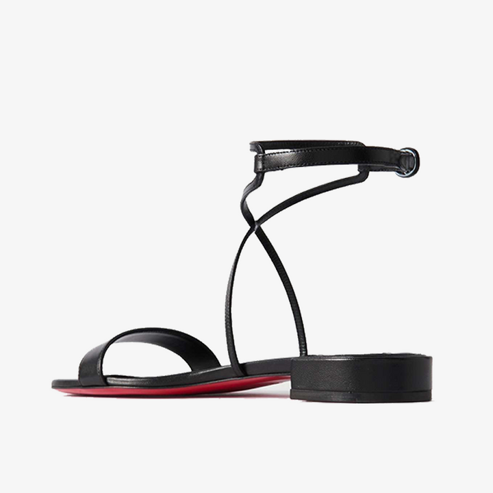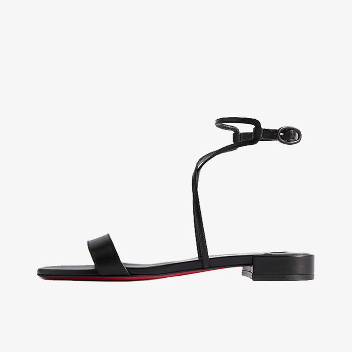These sandals are defined by their fixed, foot-framing straps, with a buckle-fastening ankle strap to perfect the fit. Crafted from black calf leather, they feature iconic red bottoms that reveal themselves with every step. Set on a comfortable 30mm heel, they offer both style and ease.
