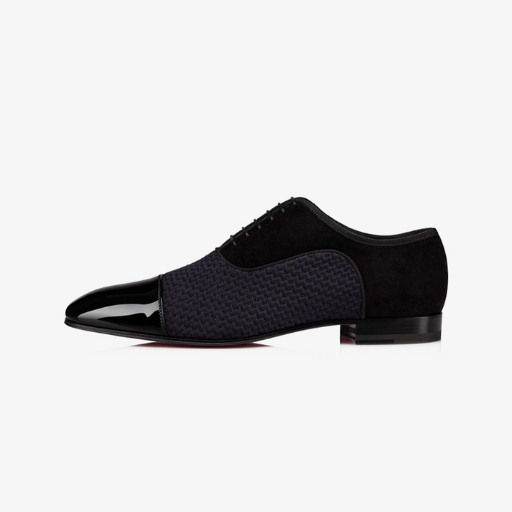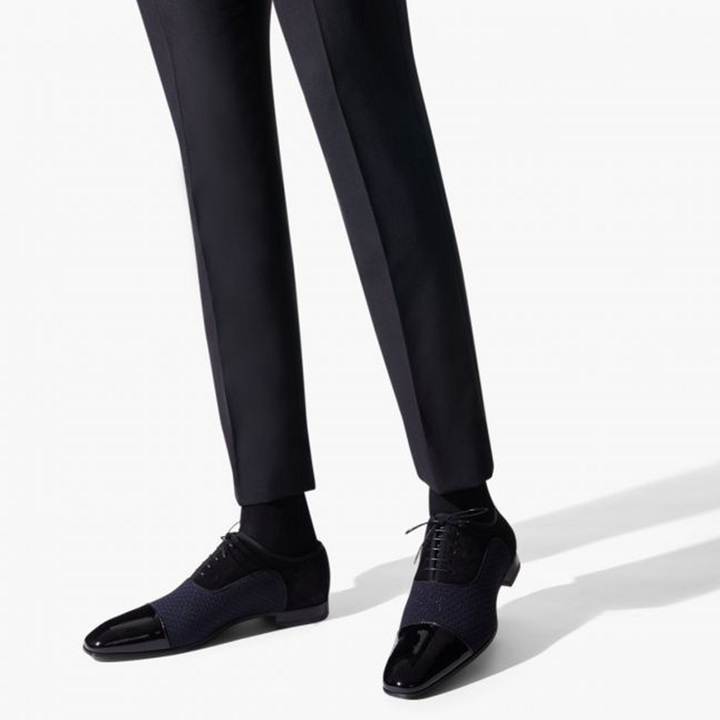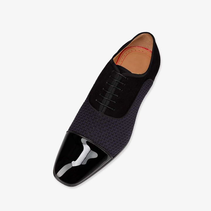 This black city shoe merges textures for a sophisticated, slender silhouette. Crafted from a blend of patent leather, calfskin suede, and chevron fabric, it is elegantly trimmed with grosgrain for a refined finish. Set on a discreet heel with meticulous craftsmanship, the lace-up vamp accentuates its sleek, urban design.Upper: 100% patent calf leather , suede ,fabric