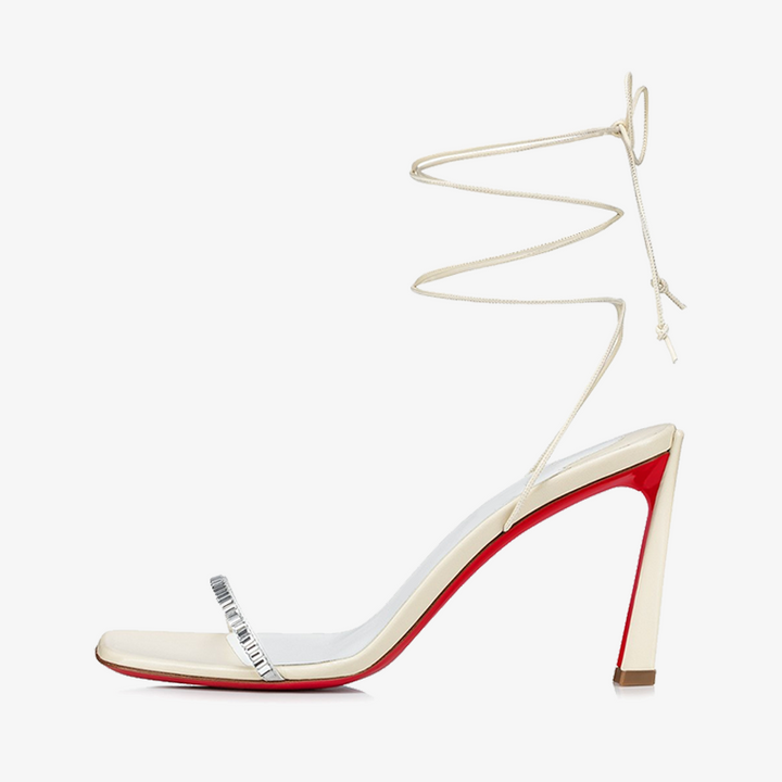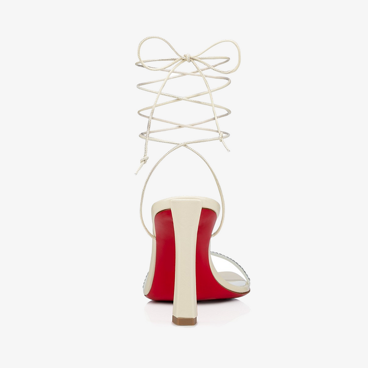 The simple yet stunning sandal exudes modern sophistication with edgy details. The 100 mm heel reveals the signature red sole from both the side and top of the arch, adding a bold contrast. Crafted in elegant ivory crepe satin, this model is perfect for weddings, featuring delicate satin laces that tie gracefully around the ankle for a refined, feminine finish.