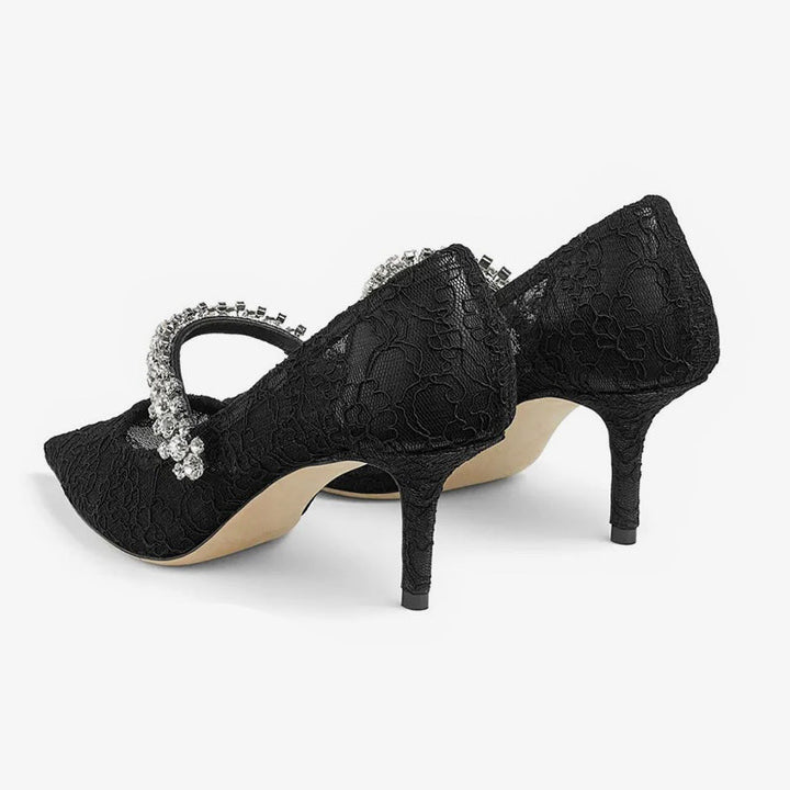 These elegant mid-heel shoes feature delicate lace details, a crystal-embellished design, and a pointed toe. With a tapered heel and leather sole, they offer both style and comfort. The upper is crafted from 95% fabric and 5% lambskin, with a nylon lining for added softness.