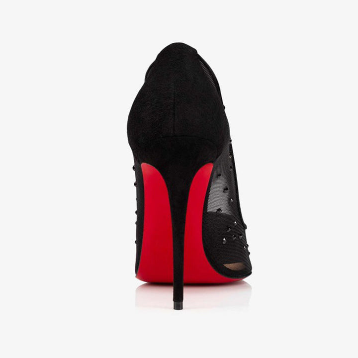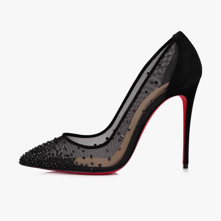 A stiletto with a graceful 100 mm heel, this iconic pump is adorned with hand-placed shimmering strass from toe to tip. For an ultra-luxurious finish, the heel is wrapped in soft black velvet , adding depth and refinement to the overall silhouette.