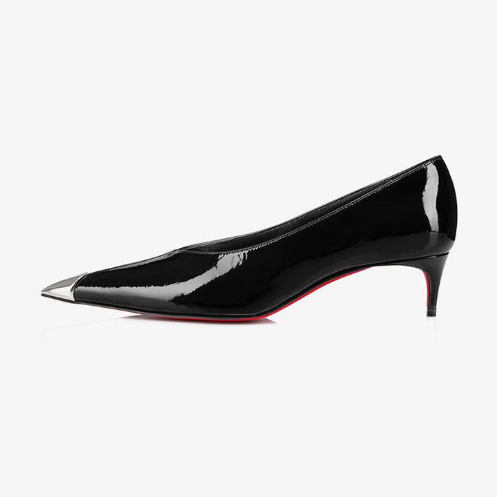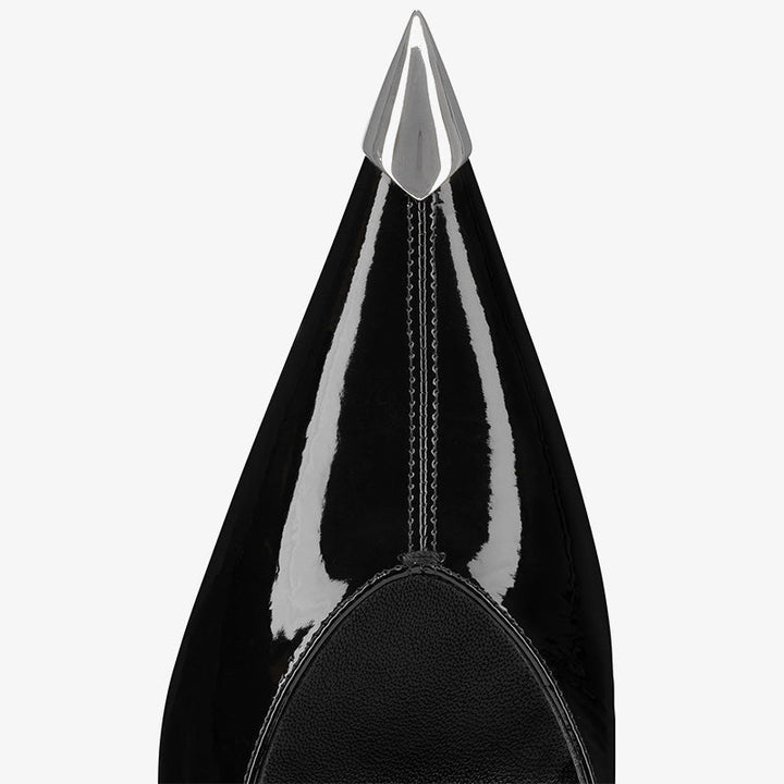 These pumps exude elegance and sophistication. Crafted entirely from glossy black patent calfskin leather, this stunning pair features a 60 mm heel and a pointed toe with a subtle metallic sheen, inspired by the refined silhouette of rose thorns. The patent leather's supple nature ensures both flexibility and comfort, making this design as wearable as it is striking.