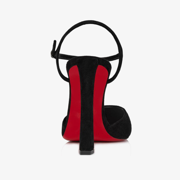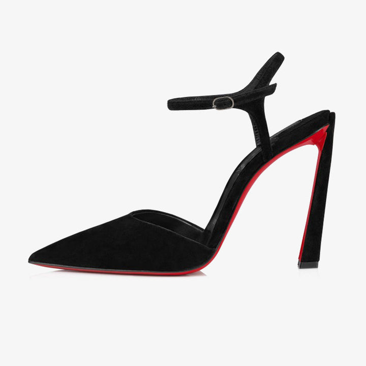The pump has a pointed toe reminiscent of a bird’s beak, giving it a bold, distinctive look. This sophisticated style in black velvet features a daring low-cut vamp that elegantly reveals the foot. Set on a 100 mm slanted heel, it is completed with a slender ankle strap for a refined and secure fit.