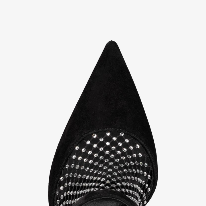 This pump sandal features a striking fishnet upper, embellished with strass and inspired by fishing nets. Named after a picturesque seaside village, this model is crafted in sumptuous black veau velours on the foot and heel straps, wrapping the footbed and 100 mm stiletto heel. The almond toe box and wide sandal last ensure both elegance and comfortable wearability.