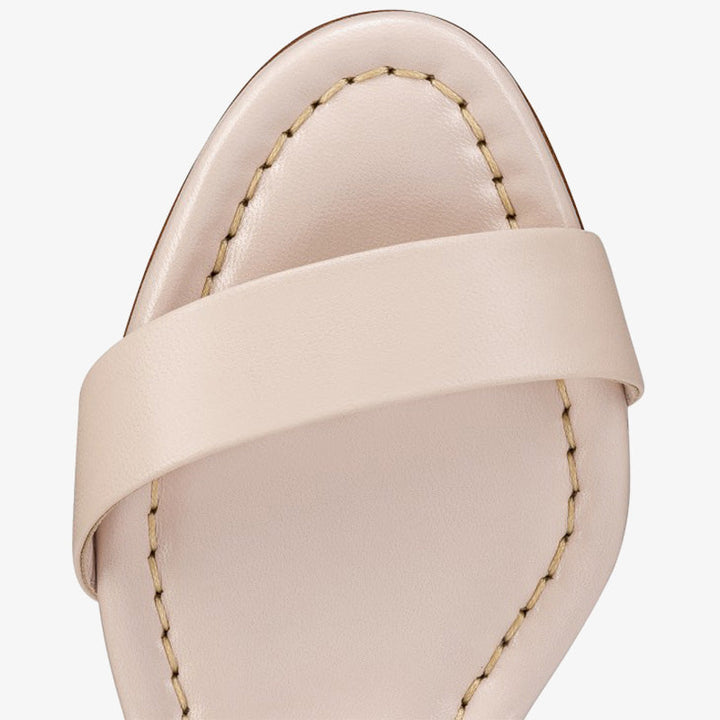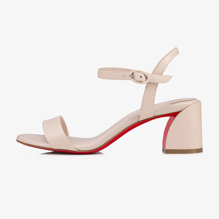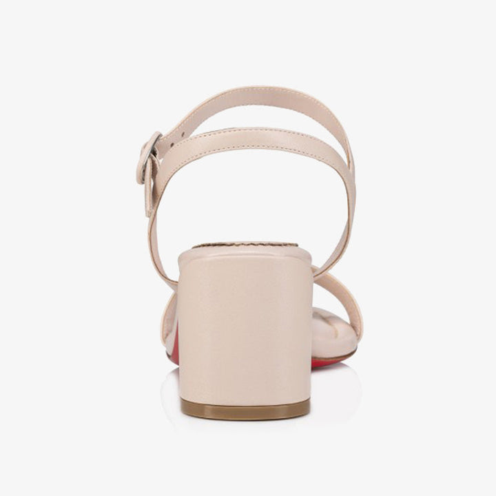 This elegant sandal is crafted from soft beige leather, offering a timeless and refined aesthetic. Featuring a rounded open toe and a daring low-cut vamp that subtly reveals the toe, it balances allure with sophistication. Two slender straps fasten with delicate circular buttons, adding a graceful detail. The approximately 55 mm block heel ensures all-day comfort without compromising on style. The soft leche tone enhances its versatility, perfect for both daytime charm and evening polish.