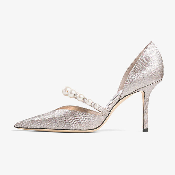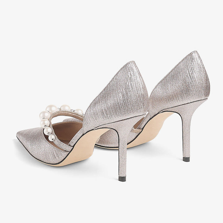 These glamorous glitter fabric pumps are defined by their pointed toe and a pearl and crystal-adorned strap. The open sides and arch strap add a sophisticated touch, making them the perfect statement piece for any occasion. Elegance and sparkle meet in one stunning design.The heel height of this pair is 100mm.