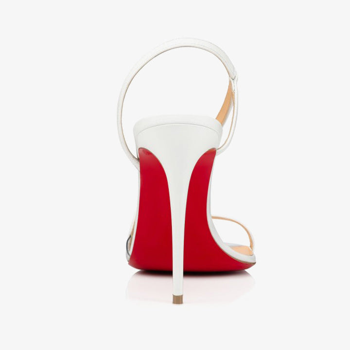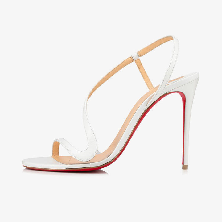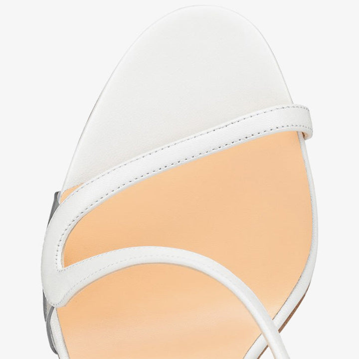 The sandal offers a stunning contemporary twist on the timeless stiletto silhouette. Crafted from buttery-soft white leather, it features an innovative strap design that begins as a slingback and wraps gracefully around the foot, ending in a delicate wave over the toe. The two-piece strap construction is supported by a subtle post strap for added comfort and style. The bold 100 mm heel elevates any look with effortless elegance, making it ideal for upscale events or chic evenings out.