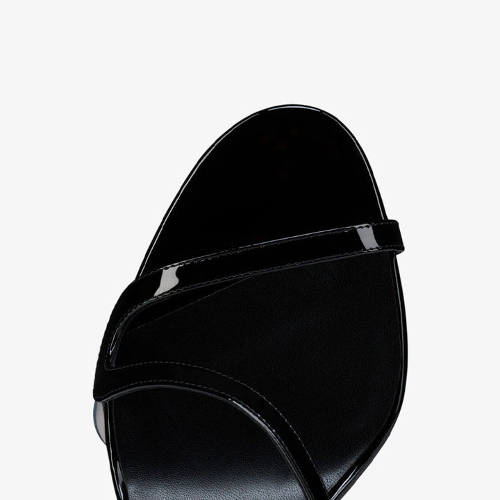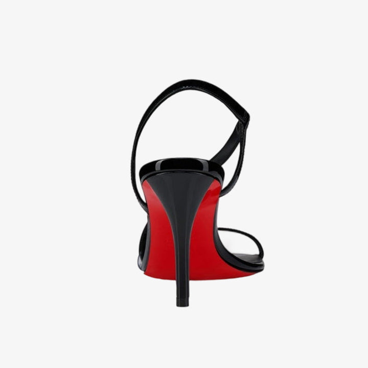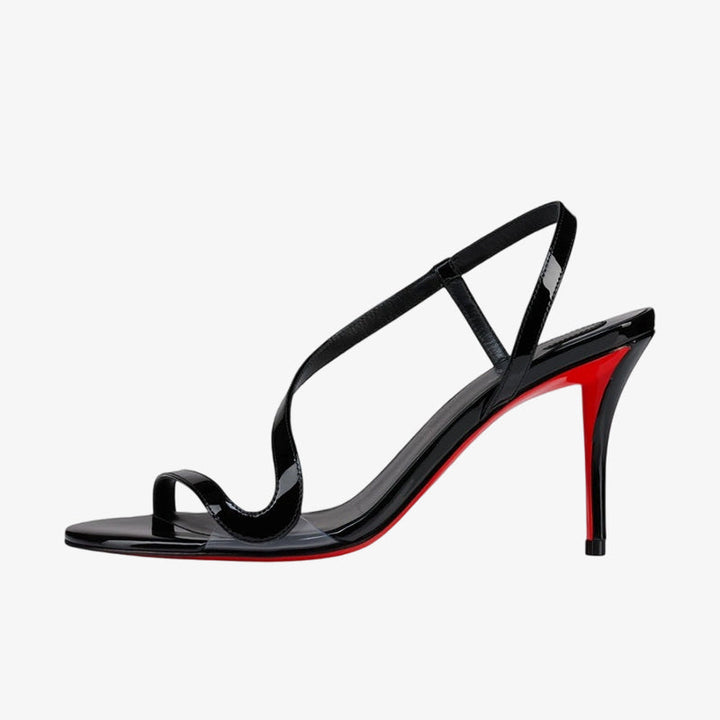 These true-to-size pumps feature an open toe, sleek stiletto heel, and a mix of black patent leather and PVC. Finished with a striking red sole for a bold, modern look.