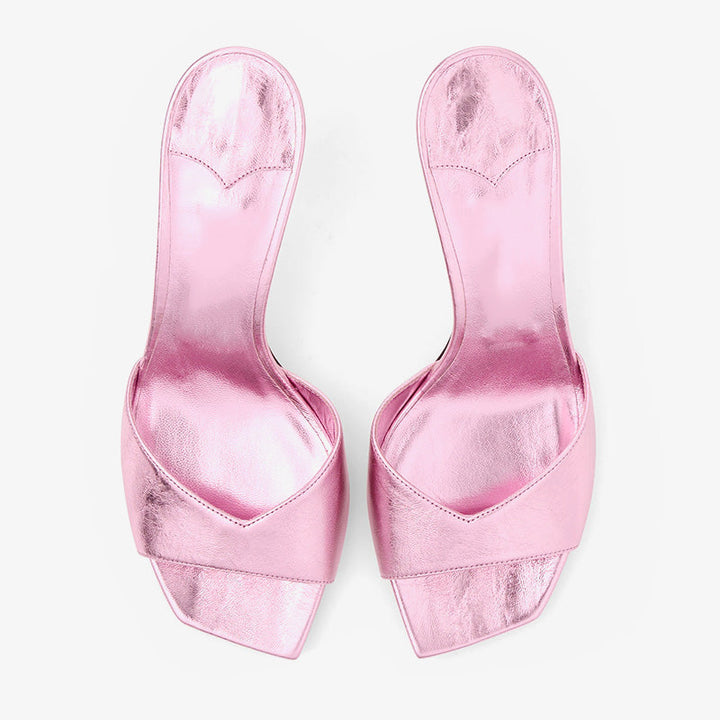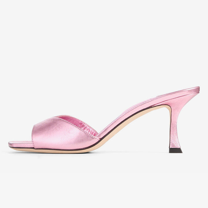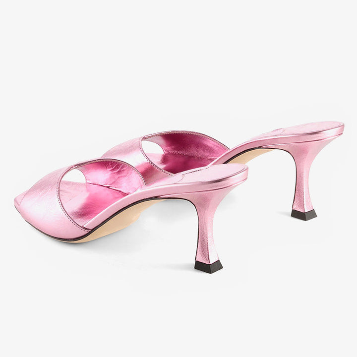 Crafted from soft metallic leather with a vintage finish, these pink sandals feature a low-cut vamp, square toe, and sculpted 70mm heel. A sleek, modern silhouette that exudes subtle glamour.