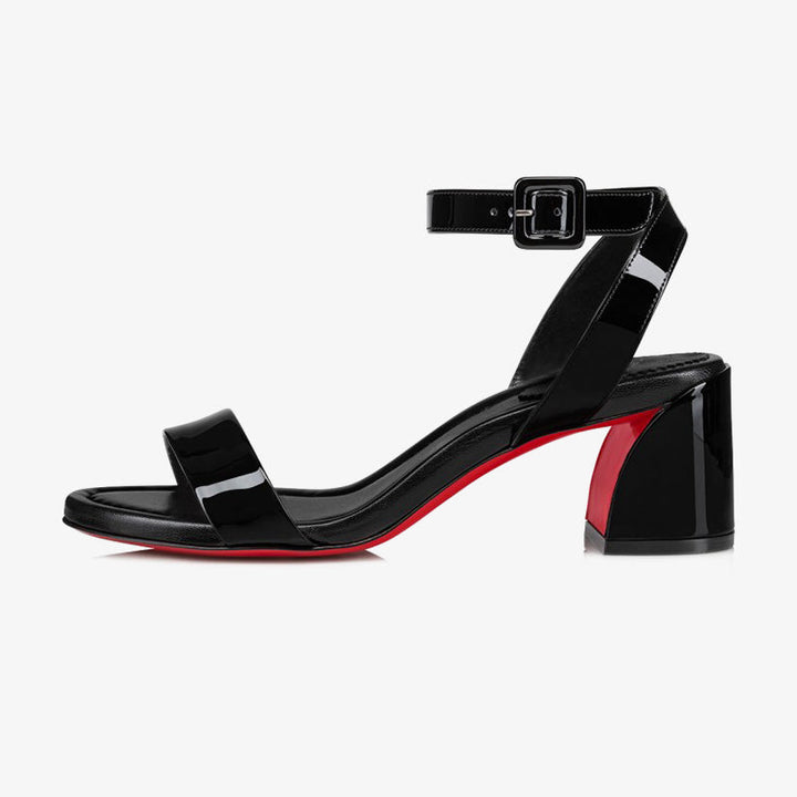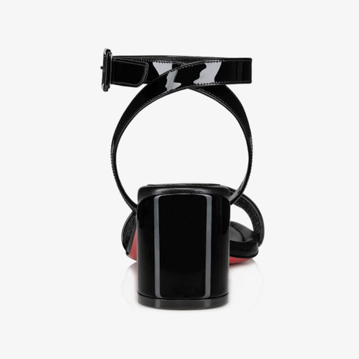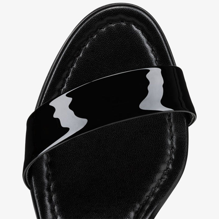 Timeless yet daring, this sleek sandal is crafted in glossy black patent calf leather and elevated on an approximately 55 mm heel. Its tonal square clasp and elegantly crossed ankle straps add a sophisticated finish, while the bold black tone enhances its chic appeal. Perfect for evening events or upscale daywear, it brings a modern edge to a classic silhouette.