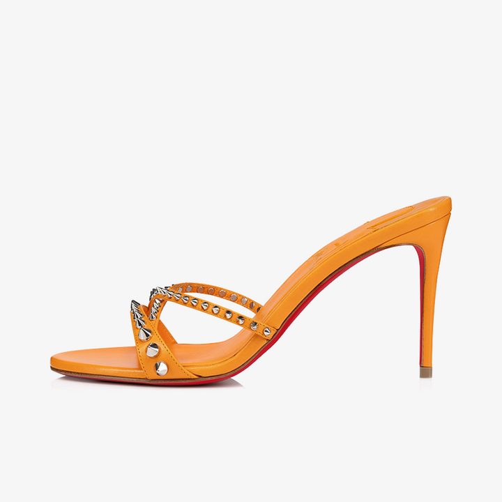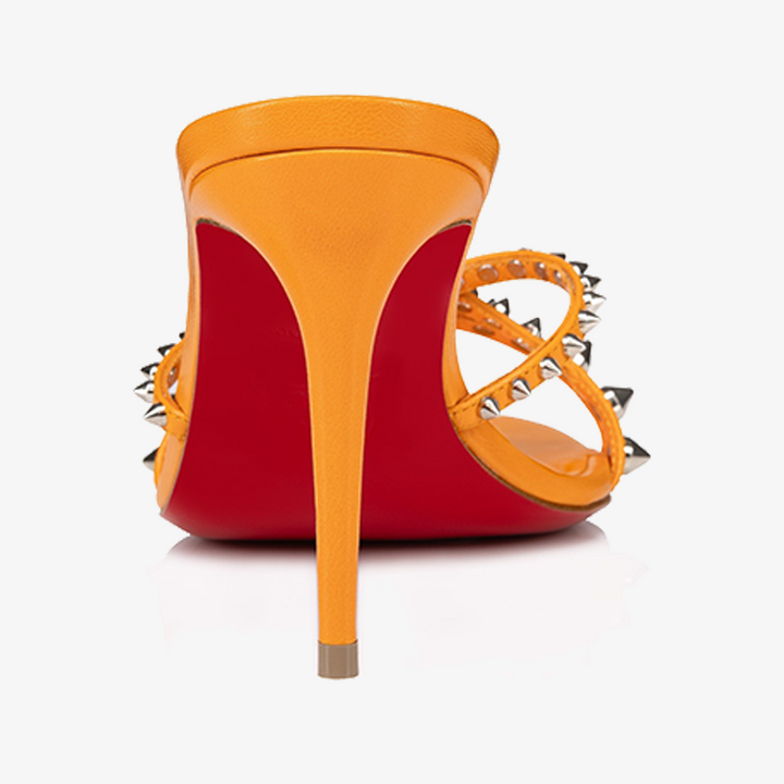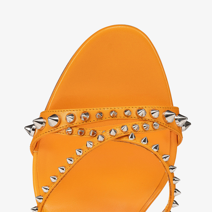 The sandal features slender straps crossing over the foot, adorned with bold spikes for a touch of edge. This sleek orange leather model is set on an 80 mm heel, combining style and comfort in one striking design.