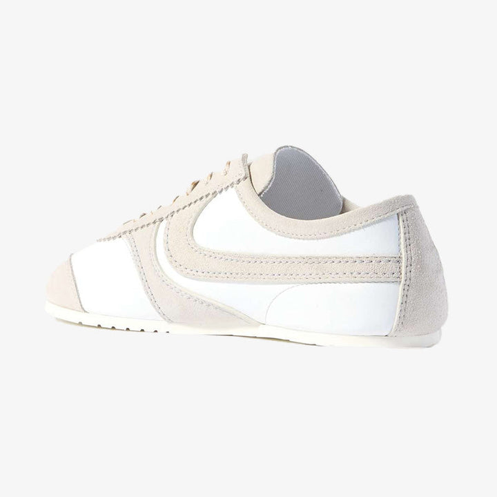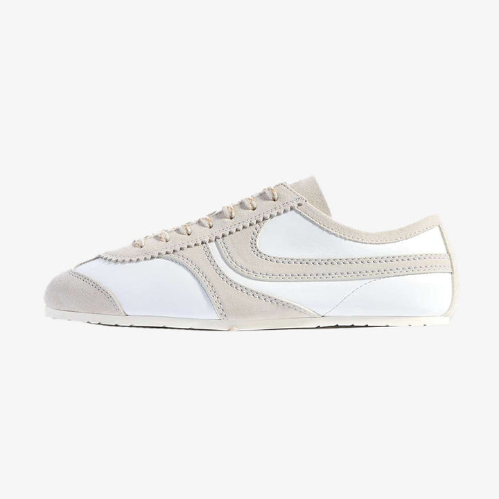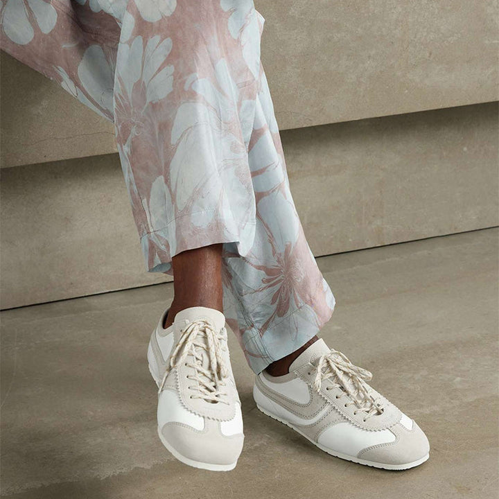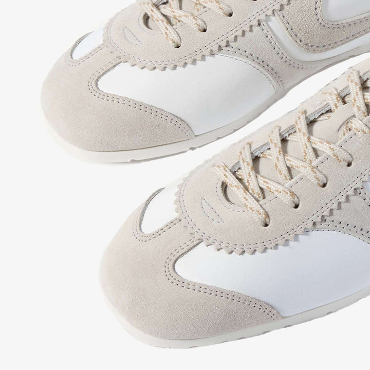 These sporty retro-style sneakers are made from soft beige suede and white leather, offering a chic contrast. The scalloped tongues and contrasting leather panels add a unique touch, while the speckled tongues enhance the playful design. With a slight heel for added comfort, these sneakers are versatile enough to be worn with everything from jeans to dresses, perfect for elevating any casual look with a stylish edge.