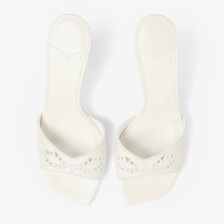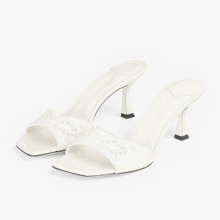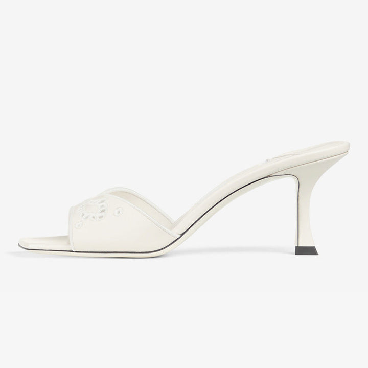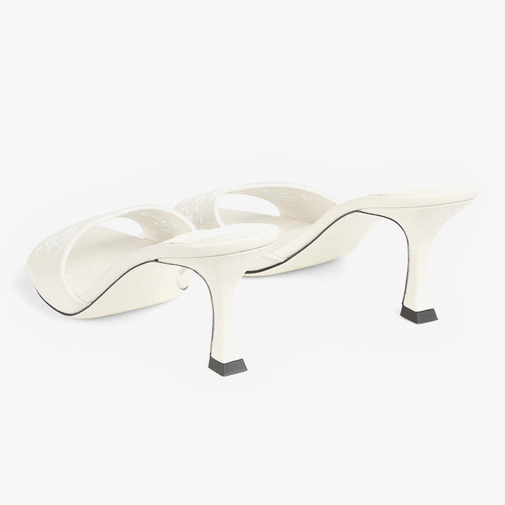 These white calf leather sandals showcase intricate embroidery, a low-cut vamp, square toe, and sculpted 70 mm curved heel, finished with a leather lining and sole for a refined slip-on style.Color:white