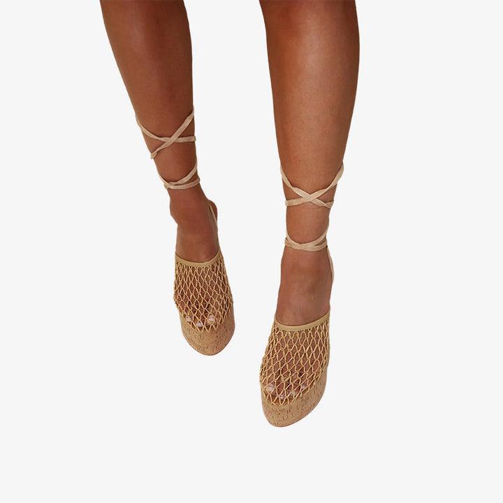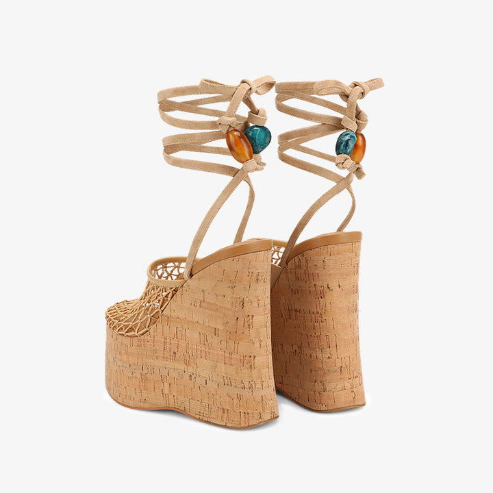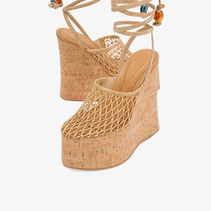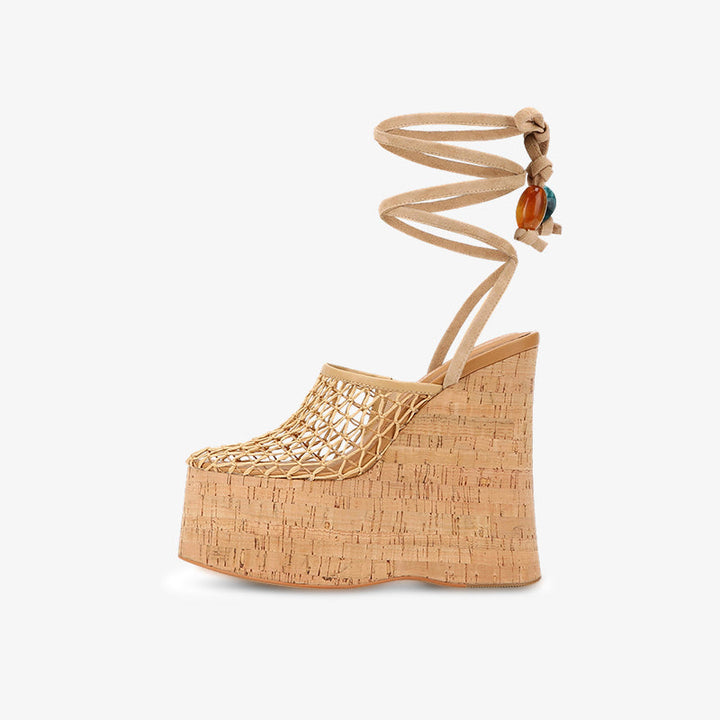 Elevate any summer look with these woven cork wedge clog heels. Featuring a high-quality fishnet upper, soft calf suede leg tie with bead detail, and a shiny cork-wrapped platform, they combine comfort and statement style. Finished with a full leather insole, leather lining, and durable rubber sole for all-day wear.